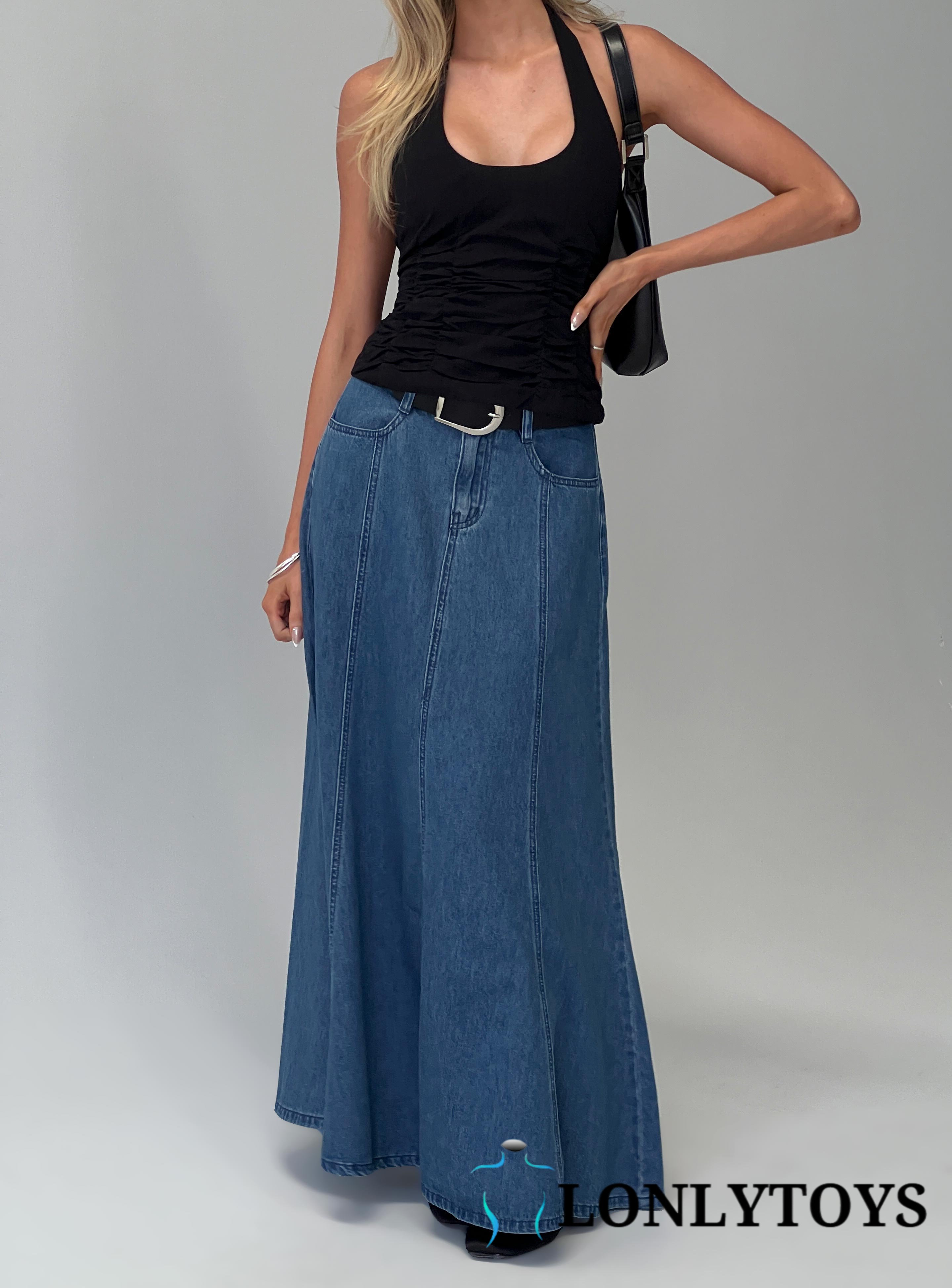 Charleigh Soft Pleat Denim Maxi Skirt Mid Blue Wash
