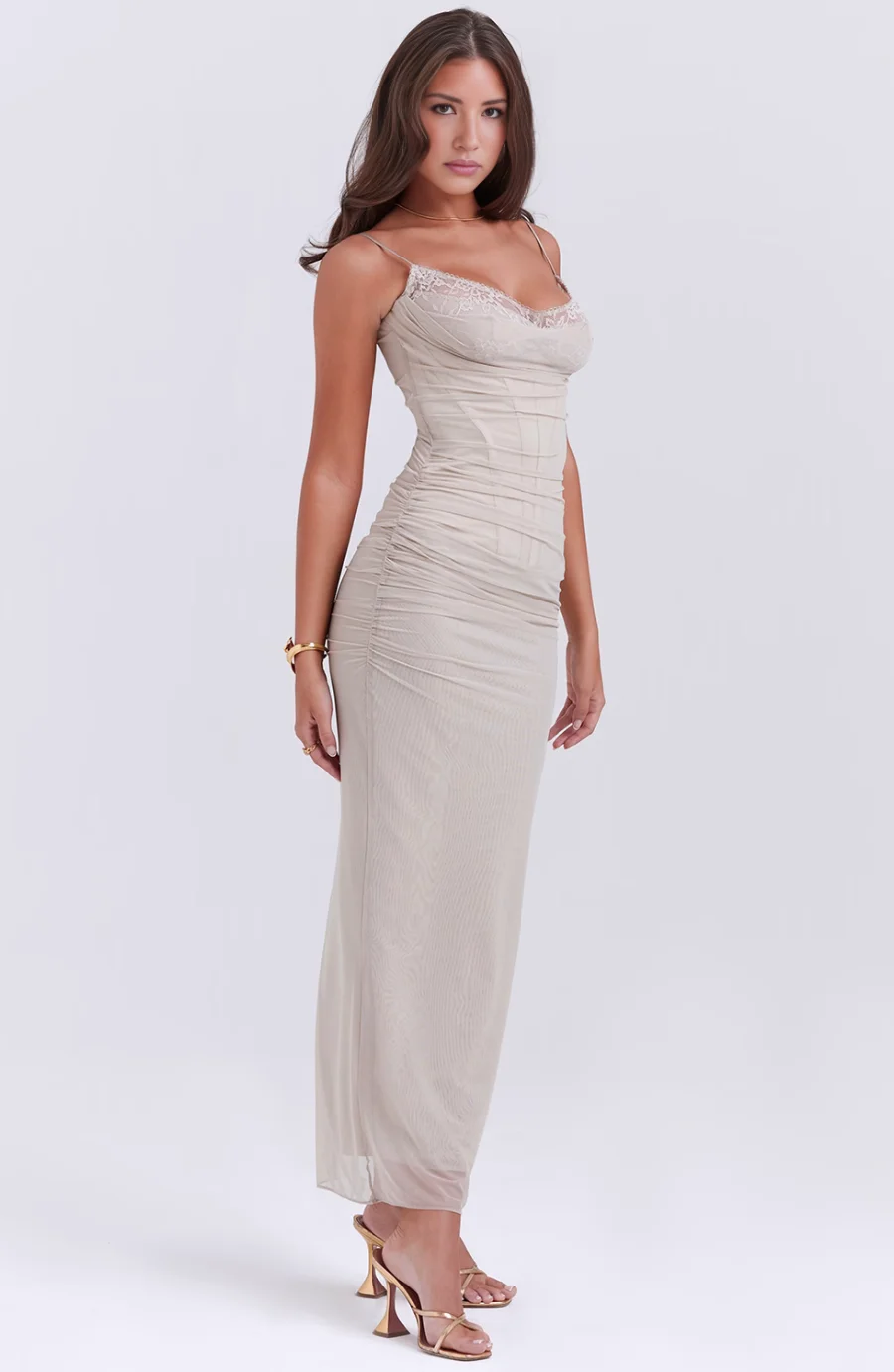 The soft, neutral colour and thin straps add to the dress’s understated charm, while the figure-hugging design offers a refined yet sensual touch. Whether for formal events, evening dinners, or a special occasion, the Elysian slip dress is designed to highlight your natural beauty with grace and style.
