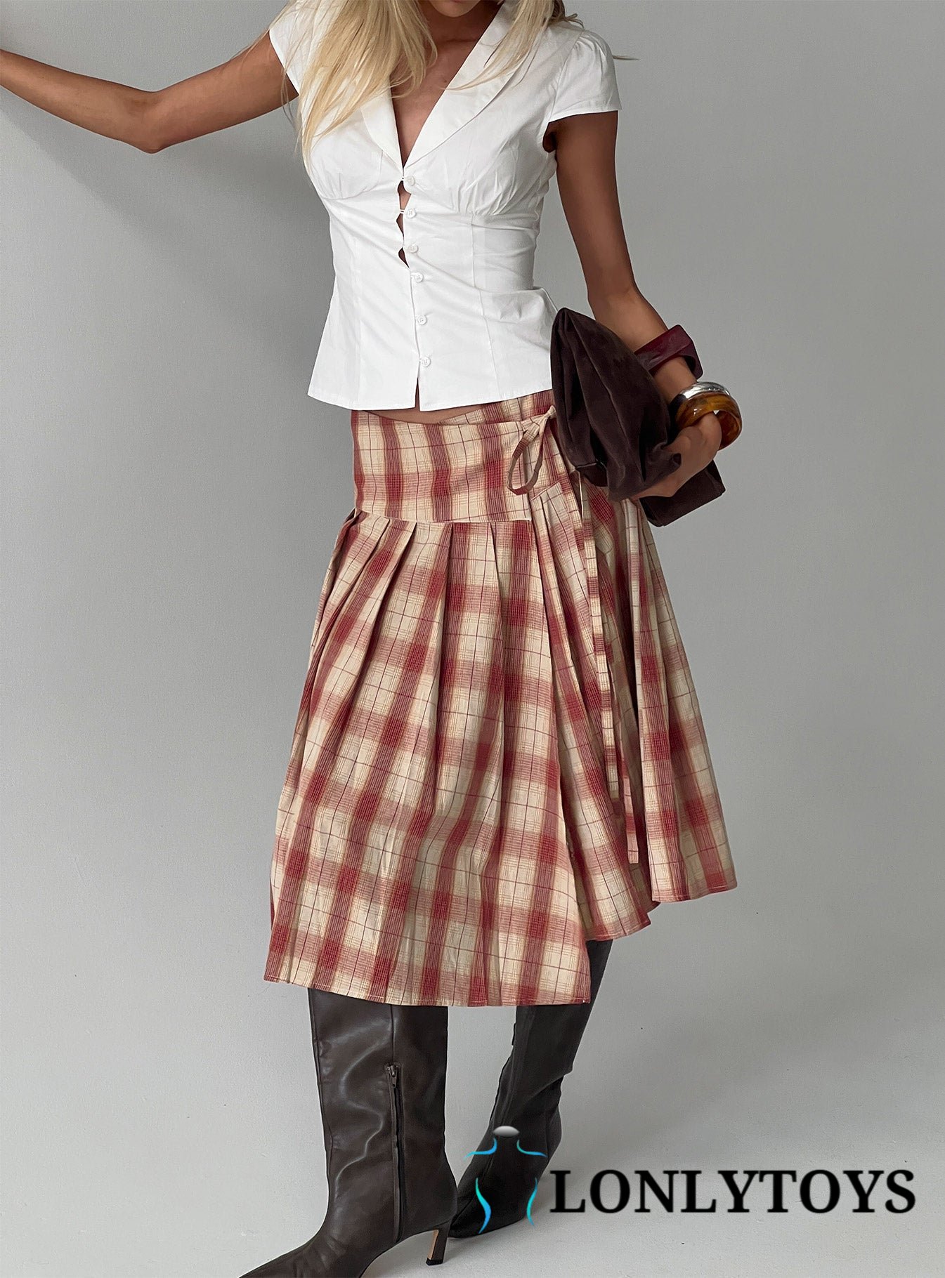 Norie Wrap Pleat Midi Skirt Red Plaid